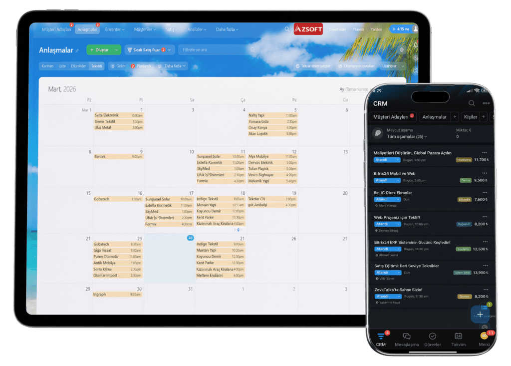 Müşteri ilişkilerinizi, satış süreçlerinizi ve ekip koordinasyonunu yalnızca ofisten değil, her yerden yönetin. Bitrix24 mobil uygulaması ile hareket halindeyken bile iş akışınıza bağlı kalın.